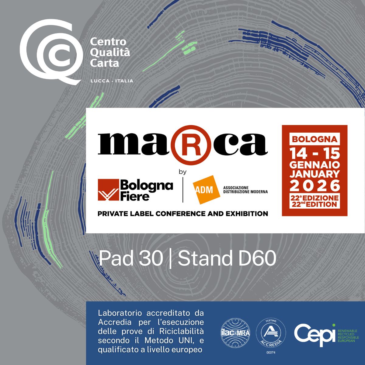 Anche quest'anno saremo presenti con il Centro Qualità Carta, laboratorio indipendente e accreditato a livello internazionale, riconosciuto anche nel mondo della GDO come punto di riferimento per lo sviluppo, il controllo qualità e la certificazione dei prodotti a base cellulosica.